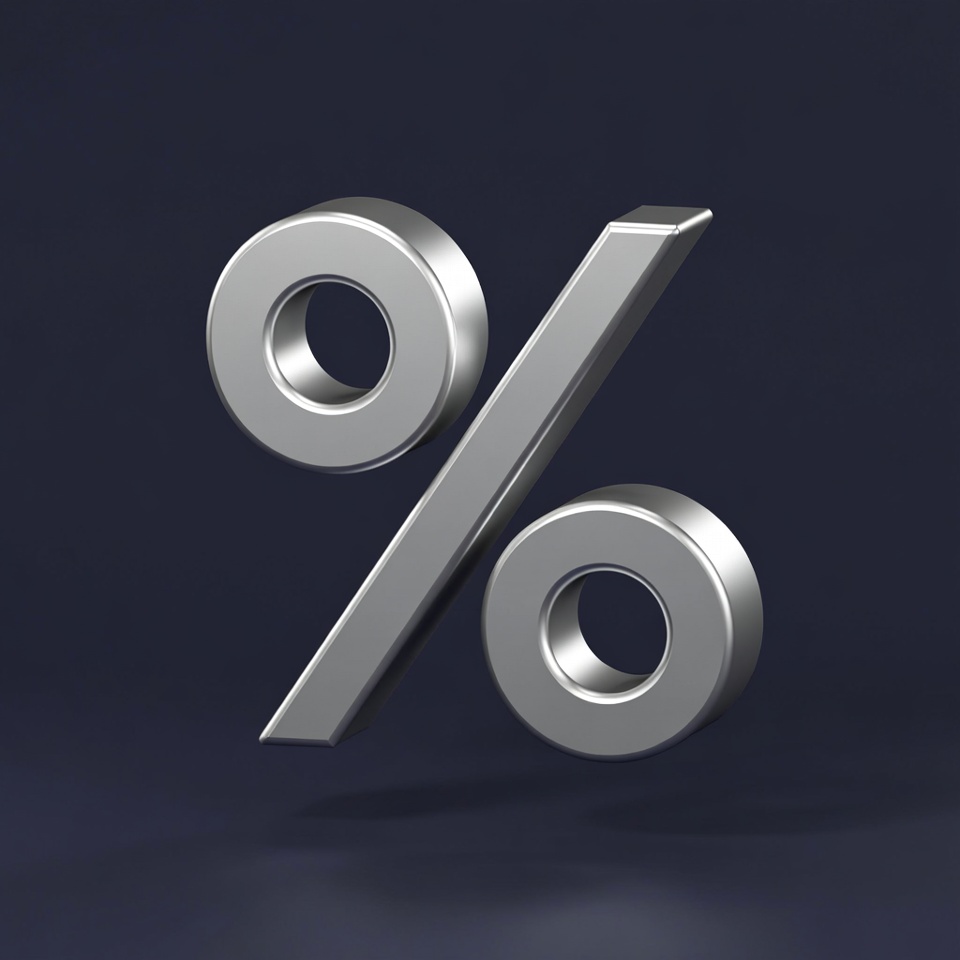 A metallic silver percent symbol (%) floats against a dark blue background. The symbol features a glossy, 3D metallic finish with reflective highlights and smooth edges. It is rendered in a realistic CGI style.
