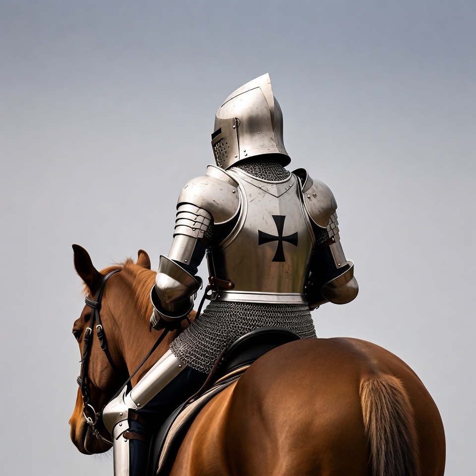 A medieval knight in full silver plate armor with a black cross on the back rides a brown horse. The knight wears a pointed helmet and chainmail, viewed from behind against a clear blue sky. The horse stands calmly with its tail visible.