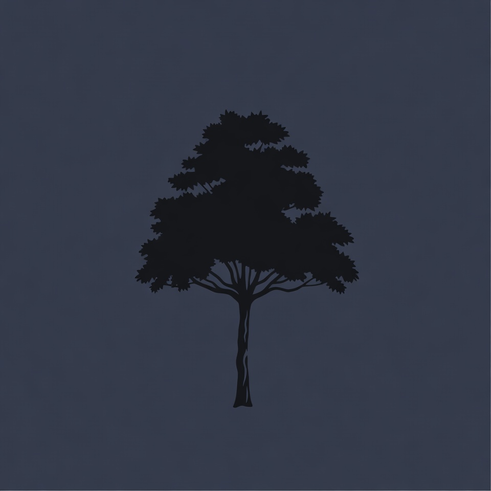 A tall tree with dense foliage and a sturdy trunk is depicted in stark black silhouette. It stands centered against a solid dark blue background. The illustration features smooth outlines and no additional elements.