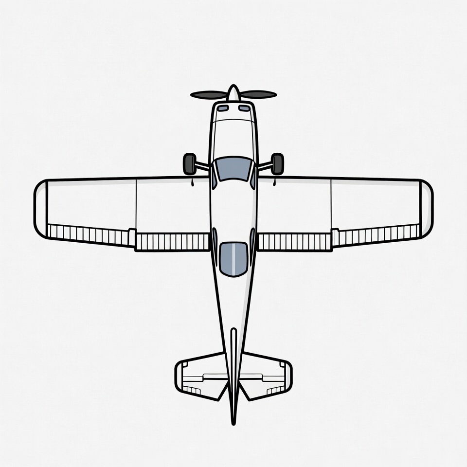 aircraft, aviation, clipart, cockpit, illustration, isolated background, landing gear, line art, overhead view, prop plane, propeller plane, single engine, small plane, top view, white airplane, wings, airplane