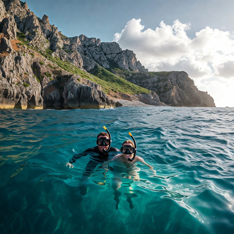 A man and woman wearing black wetsuits and snorkels swim together in vibrant turquoise ocean water near rocky cliffs. Lush green vegetation covers the steep cliffs under a partly cloudy sky. The clear water reveals underwater details around them.