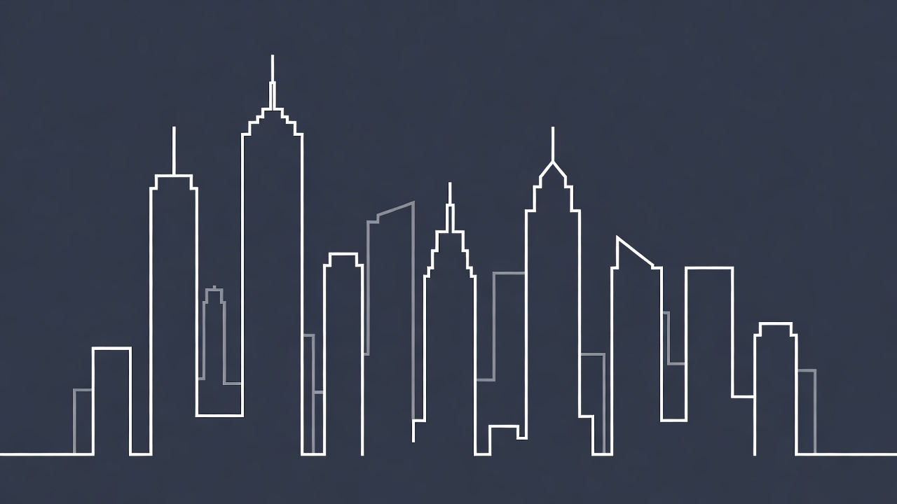 A minimalist line art illustration of the New York City skyline features tall skyscrapers with pointed spires on a dark background. The white outlines create a striking silhouette of iconic buildings like the Empire State Building. The design is simple and isolated against the navy blue backdrop.
