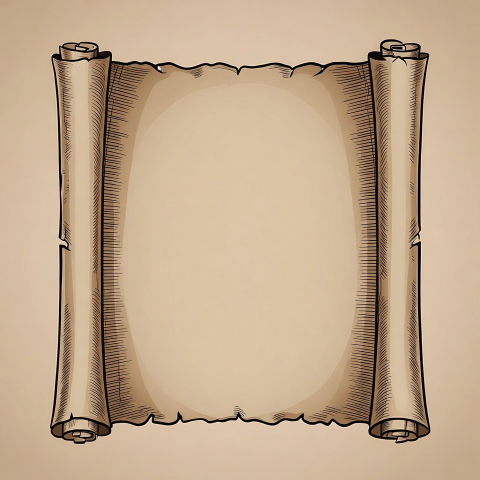 A detailed illustration of an ancient parchment scroll with rolled ends on both sides. The scroll features a textured, aged paper surface with a large blank space in the center. It is presented on an isolated beige background.