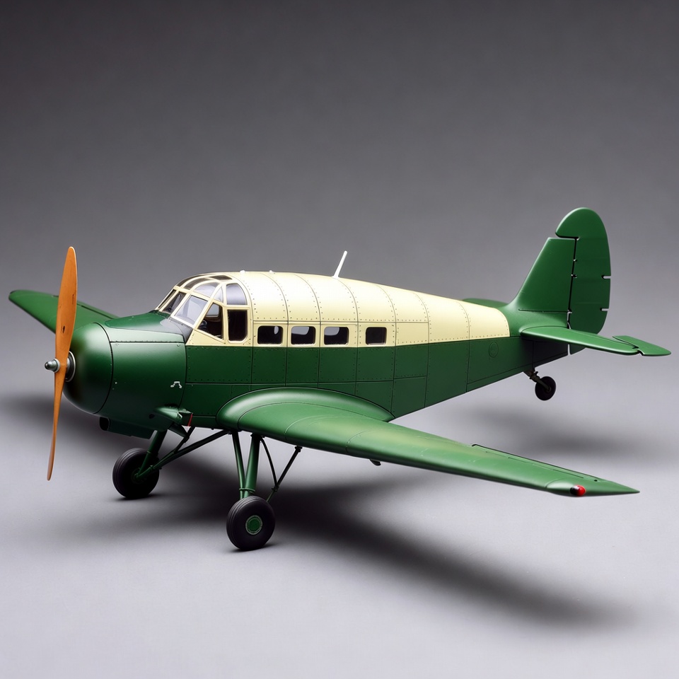 A detailed scale model of a vintage biplane features a green fuselage with a cream-colored upper section and cockpit canopy. It has a large yellow-tipped propeller, fixed landing gear with green wheels, and is displayed against a plain gray background. The airplane shows classic 1930s-1940s design elements including struts and a tail fin.
