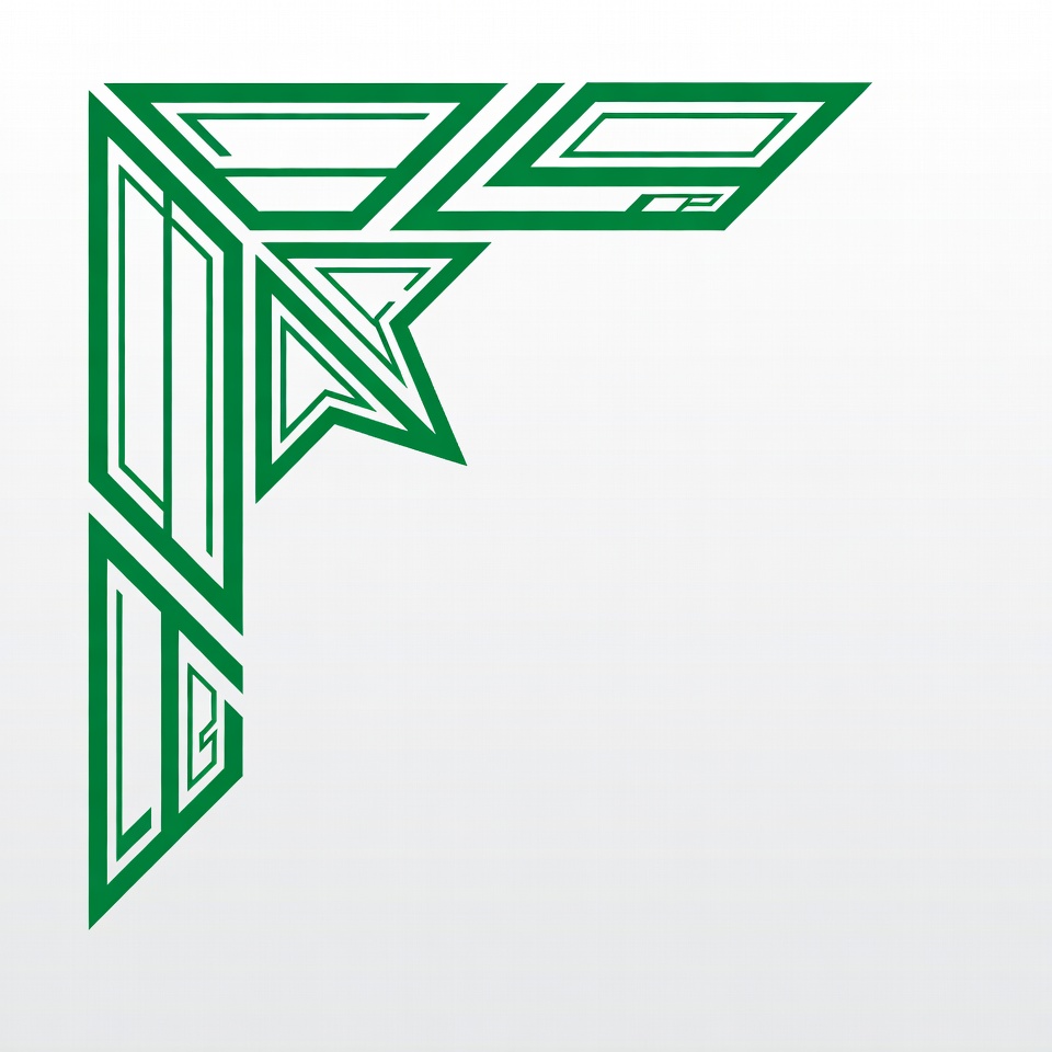 A intricate green geometric border design occupies the bottom-left corner of a white background. It features sharp angular shapes, intersecting lines, and a central star motif. The pattern is created with bold outlines in vibrant green.