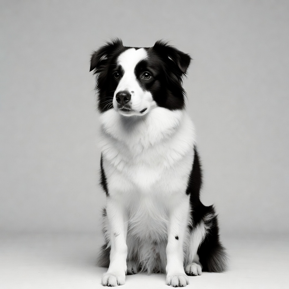 A fluffy Border Collie with black and white fur sits attentively on a plain gray background. The dog faces forward with perked ears, bright eyes, and a slightly open mouth. Its paws are neatly positioned in front.