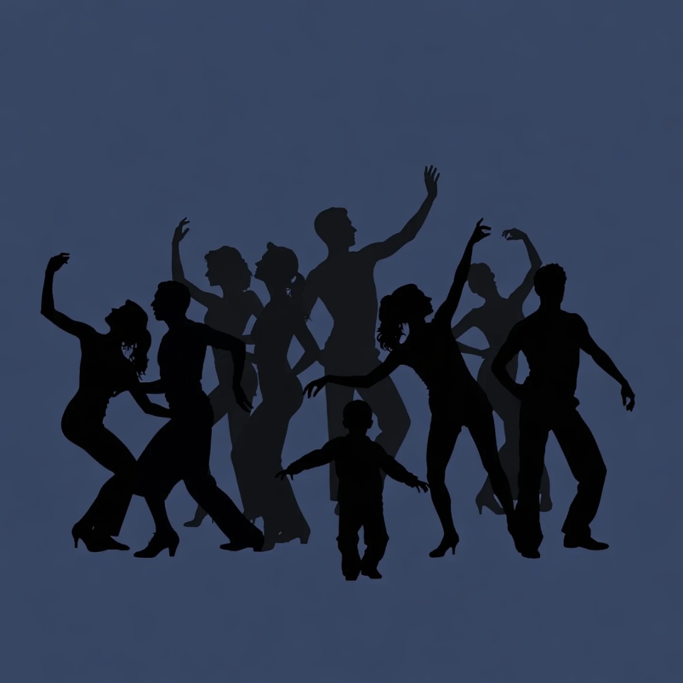 Silhouettes of multiple men, women, and a child dance energetically against a dark blue background. They strike various dynamic poses with arms raised and legs extended. The figures are black cutouts on a solid navy backdrop.