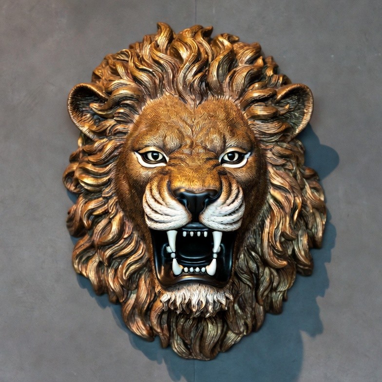 A detailed golden lion head sculpture mounted on a gray wall. The lion features a thick mane, fierce eyes, and an open mouth with visible fangs in a roaring pose. The artwork has a realistic, ornate design with textured fur and bronze-like finish.