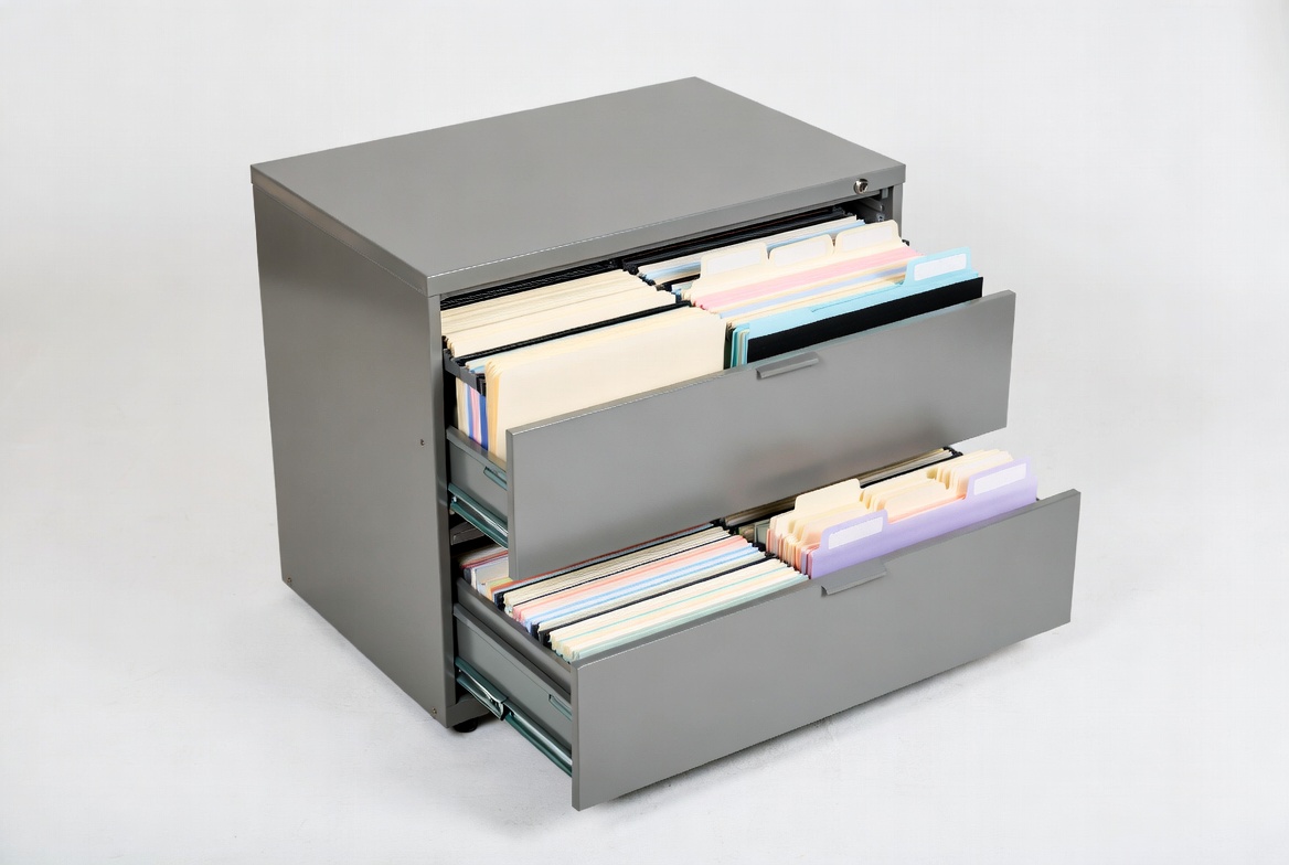 blue folders, colorful folders, document organization, file folders, gray cabinet, isolated background, metal cabinet, office furniture, office storage, open drawers, pink folders, purple folders, white folders, filing cabinet