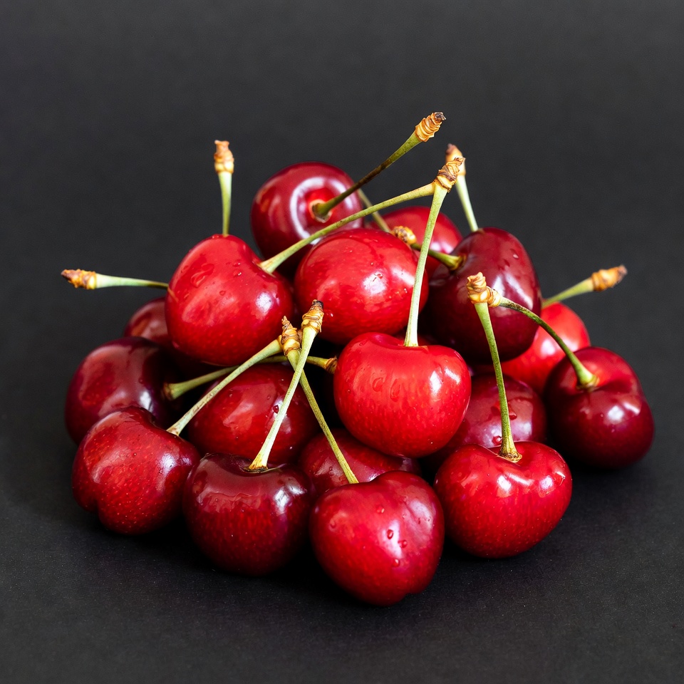 A pile of fresh red cherries with green stems is arranged on a black background. The cherries glisten slightly, showcasing their vibrant red color and smooth texture. Stems extend outward from the cluster.