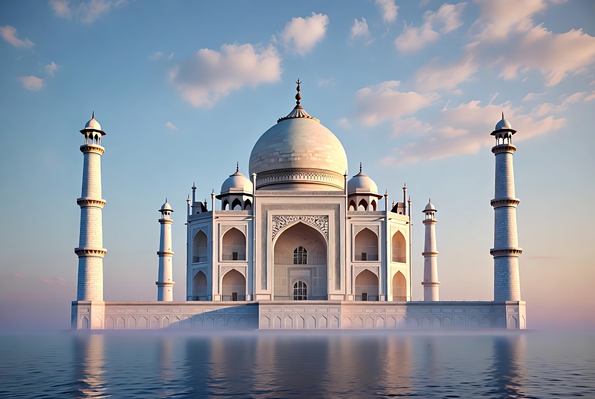 The iconic white marble Taj Mahal stands majestically with its central dome and four minarets. It appears to float on a calm reflective body of water under a twilight sky with scattered clouds. Intricate architectural details are visible on the structure.