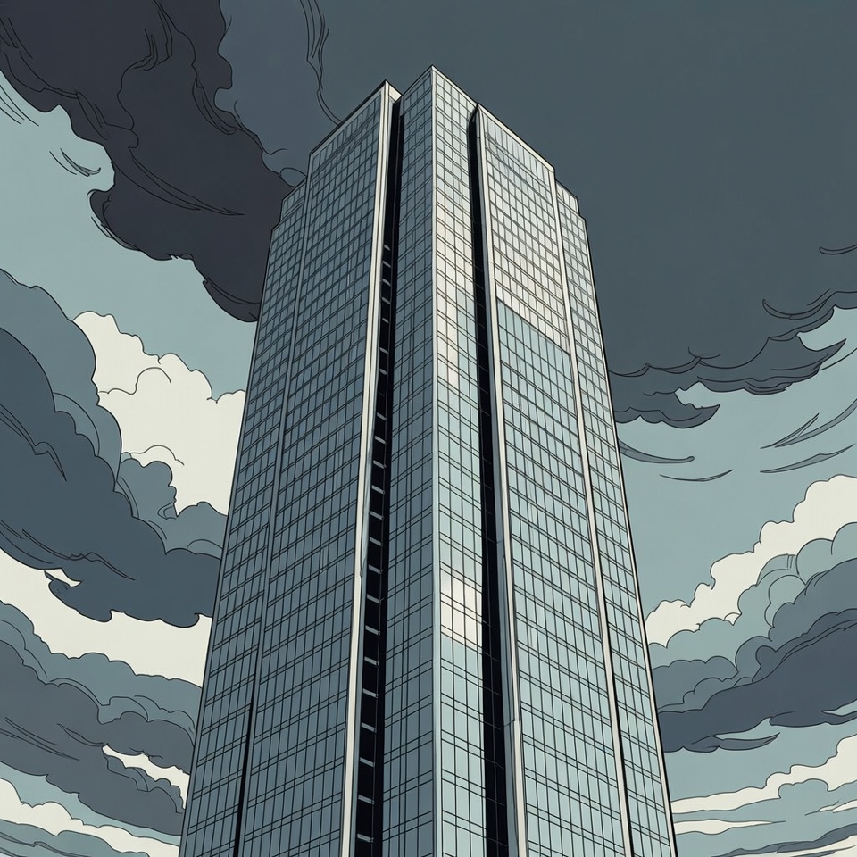 A tall modern skyscraper with reflective glass windows rises dramatically against a dark, stormy sky. Thick gray clouds swirl around the building's upper levels. The illustration features bold line art and a moody, overcast atmosphere.