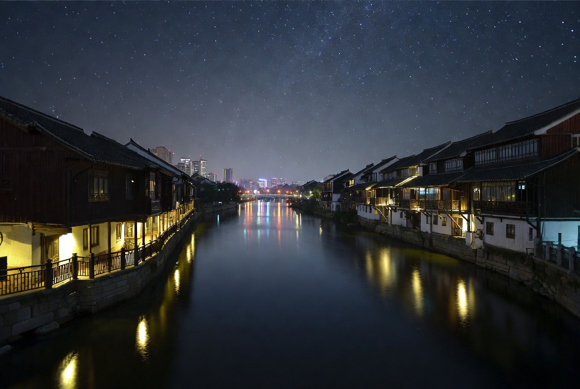 Asia, Chinese architecture, architecture, bridge, canal, city skyline, curved roofs, dark water, galaxy, illuminated houses, landscape, lanterns, night sky, nightscape, quiet canal, riverside buildings, starry sky, stars, traditional houses, travel, urban canal, water reflection, waterfront, wooden houses, Milky Way