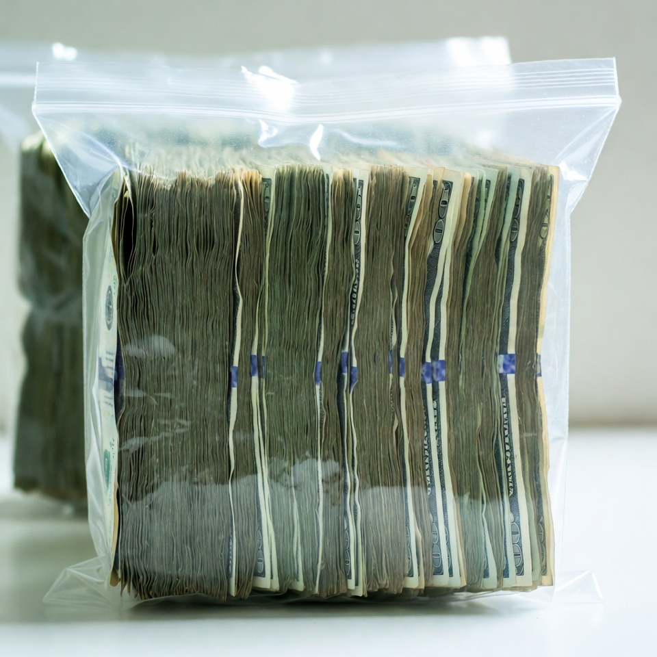 Multiple stacks of U.S. dollar bills are tightly packed inside a clear ziplock bag. The bills are bundled with blue paper straps and arranged neatly on a white surface. The transparent plastic reveals the green currency clearly.