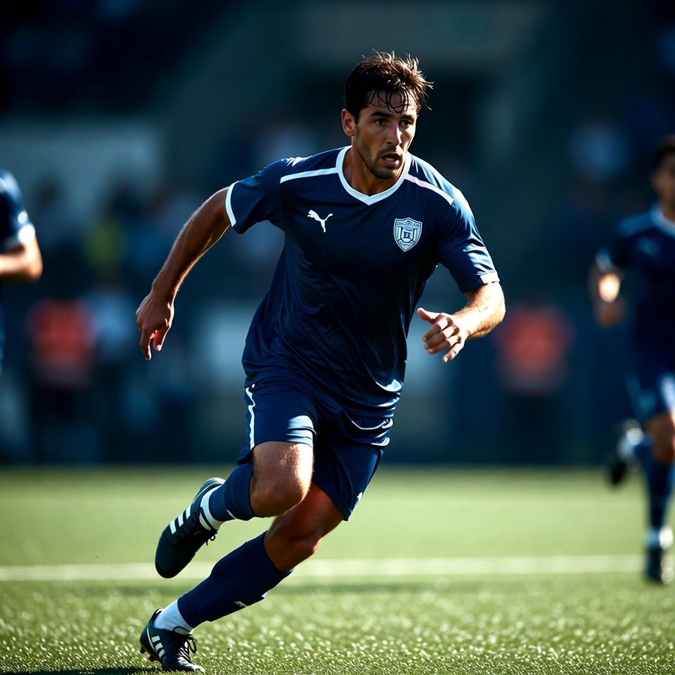 Latino, Puma, action shot, athlete, cleats, dark hair, football, male, match, muscular legs, navy jersey, running, soccer field, sports, sprinting, stadium, team uniform, turf grass, white socks, soccer player
