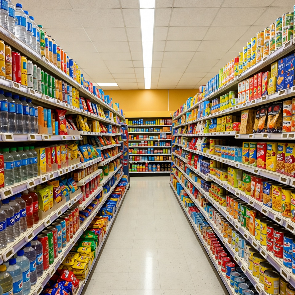 A long aisle in a grocery store is lined with tall shelves stocked with colorful products including canned goods, cereal boxes, snacks, and bottled water. The floor is clean and tiled, leading to a well-lit end with fluorescent ceiling lights. Various brands and packages in reds, blues, yellows, and greens fill the shelves on both sides.