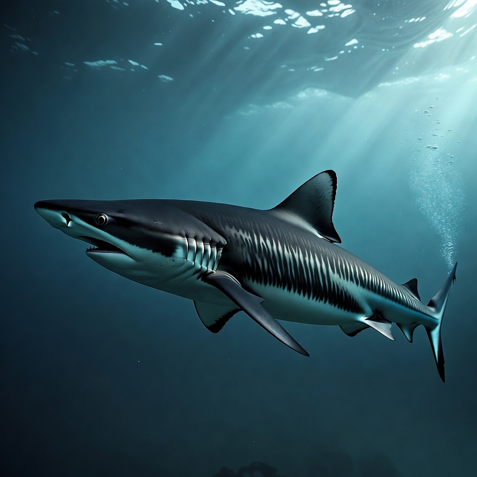 aquatic animal, black fins, bubbles, deep blue water, fish, marine life, ocean, ocean predator, predator, reef shark, sea, shark, shark fin, sunlight rays, swimming, underwater, blacktip reef shark