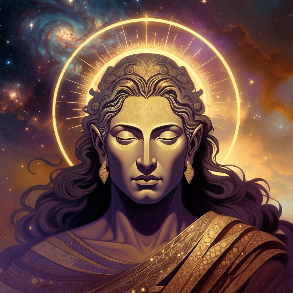 closed eyes, cosmic background, digital art, divine being, earrings, fantasy art, galaxies, god, gold filigree, golden halo, illustration, long hair, male, mystical figure, nebulae, ornate patterns, pointed ears, portrait, radiant aura, robes, serene face, space art, stars, swirling clouds, deity