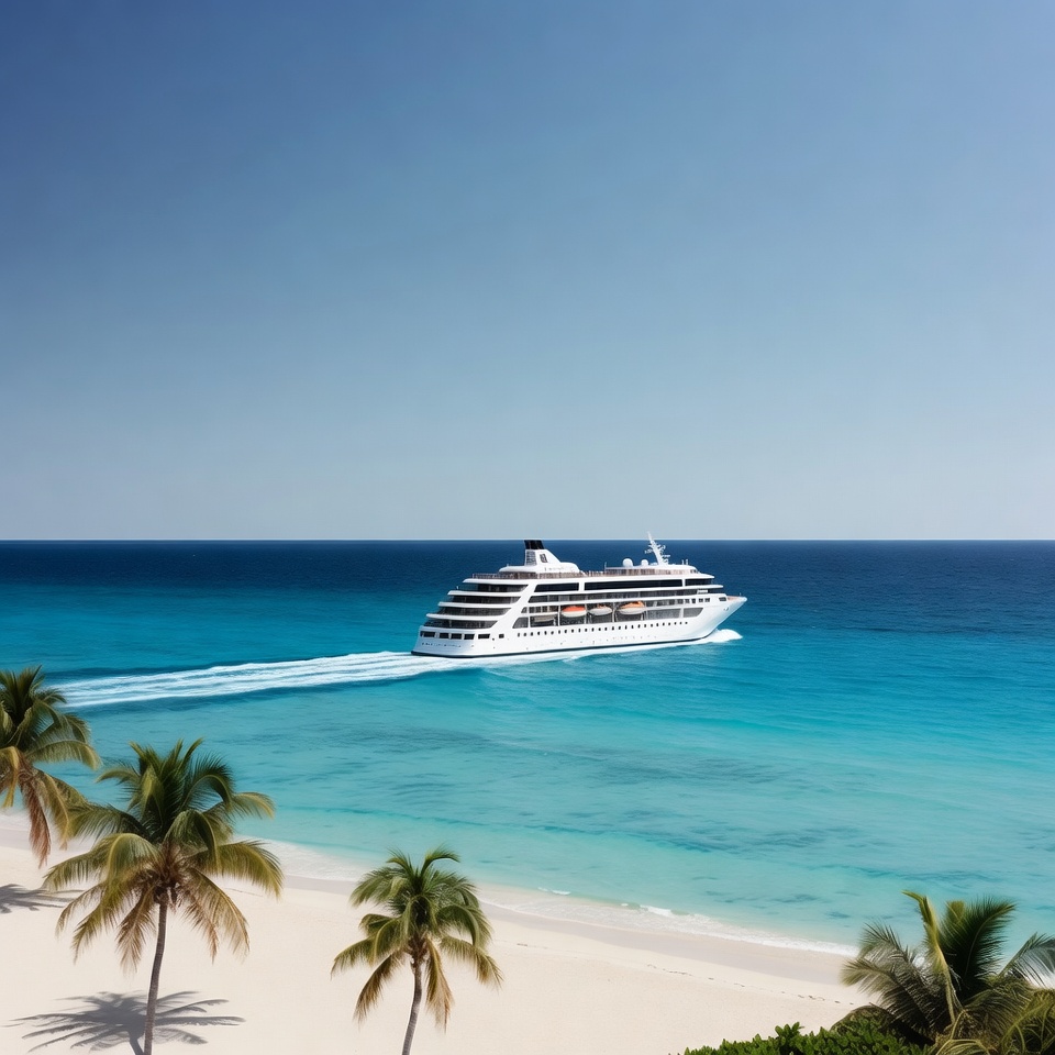 A large white luxury cruise ship sails through clear turquoise waters near a pristine white sand beach. Palm trees line the shoreline under a bright blue sky. The ship's wake trails behind it in the ocean.