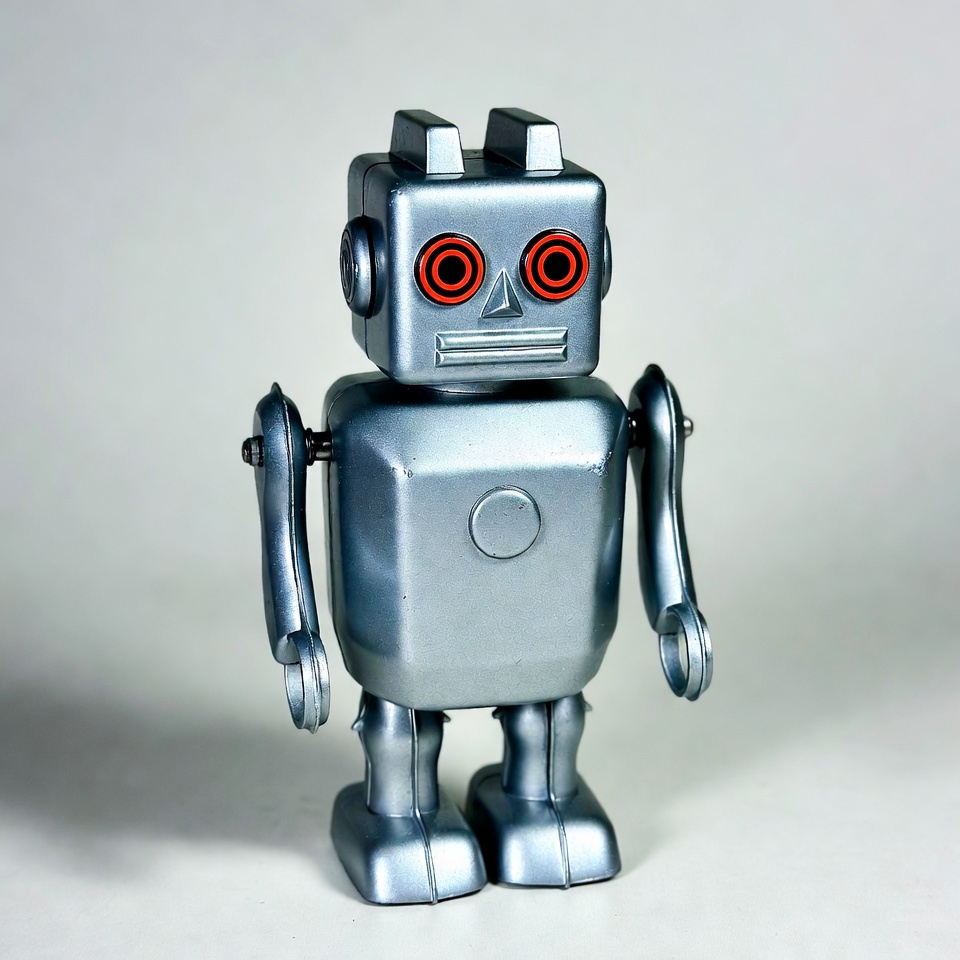 isolated background, mechanical robot, metallic robot, red eyes, retro robot, robot figure, robot toy, sci-fi robot, silver robot, standing robot, toy robot, robot