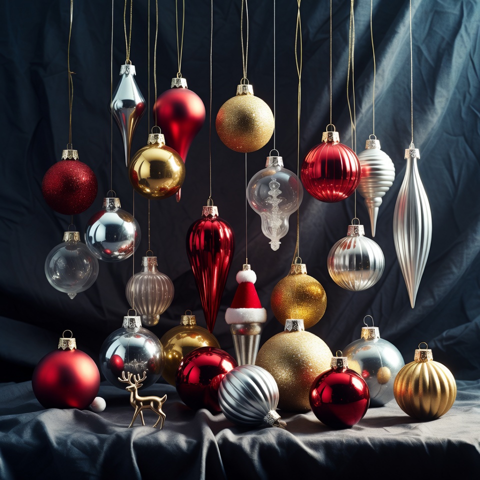 Christmas tree decor, Santa hat, clear glass, dark background, festive decor, gold balls, hanging ornaments, holiday decorations, icicle ornaments, isolated ornaments, multicolored baubles, red ornaments, reindeer figurine, shiny spheres, silver baubles, Christmas ornaments
