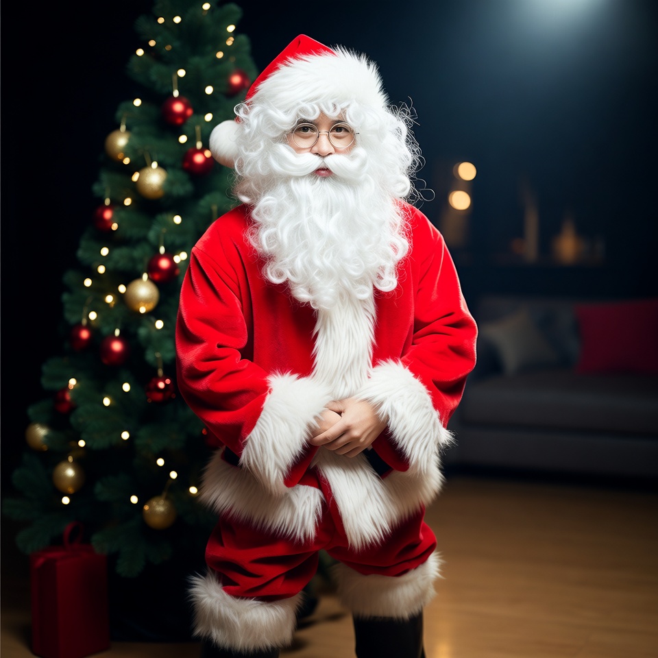 An Asian man dressed as Santa Claus stands in front of a lit Christmas tree adorned with red and gold ornaments. He wears a traditional red velvet Santa suit with white fur trim, black boots, and a matching hat, featuring a long white beard and smiling expression. The scene is set in a dimly lit room with spotlights, a couch, and a red gift box nearby.