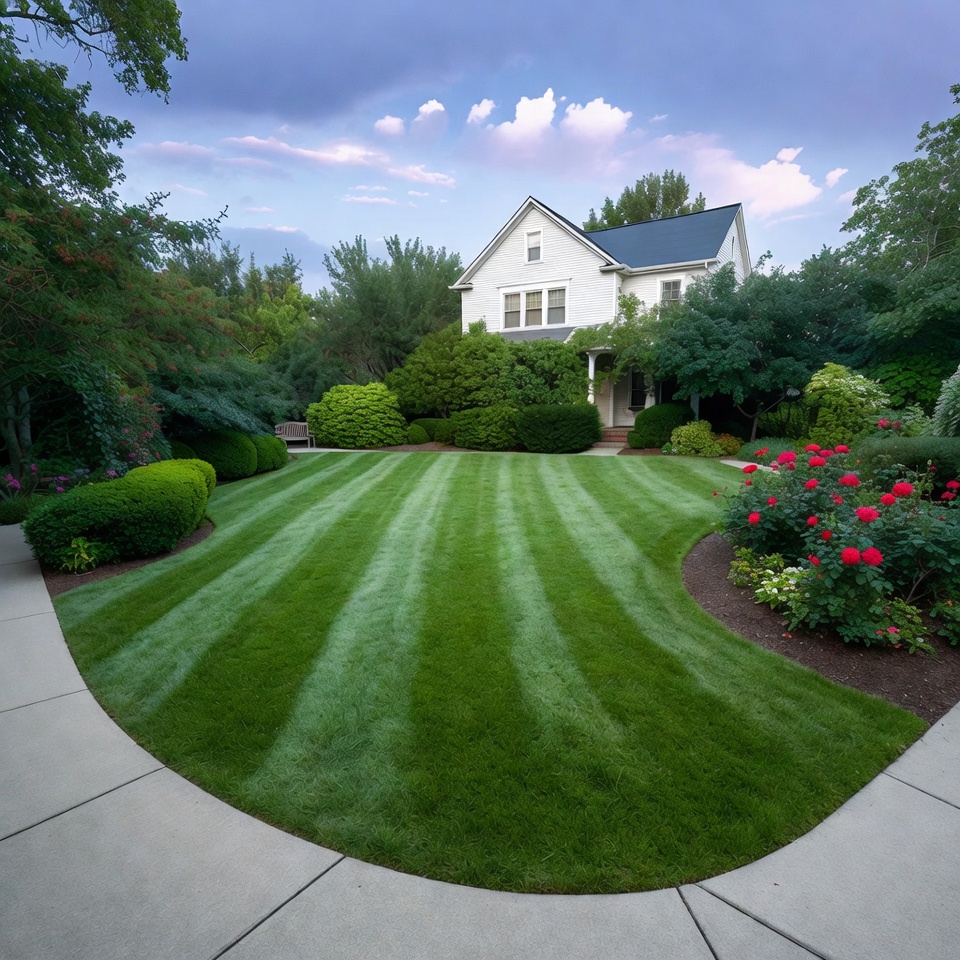 A large white house with a dark blue roof stands behind a meticulously manicured lawn and lush gardens. Vibrant red rose bushes and neatly trimmed shrubs border the striped green grass. A curved concrete pathway leads through the yard, surrounded by trees under a partly cloudy sky.
