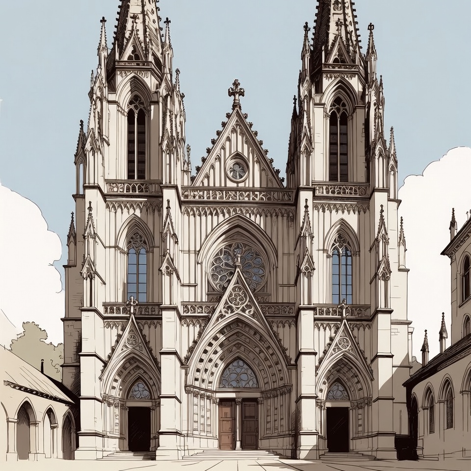 Gothic architecture, arches, architecture, blue sky, cathedral illustration, church drawing, clipart, clouds, historical building, illustration, line art, medieval church, ornate design, pointed towers, religious structure, rose window, spires, stone facade, wooden doors, Gothic cathedral