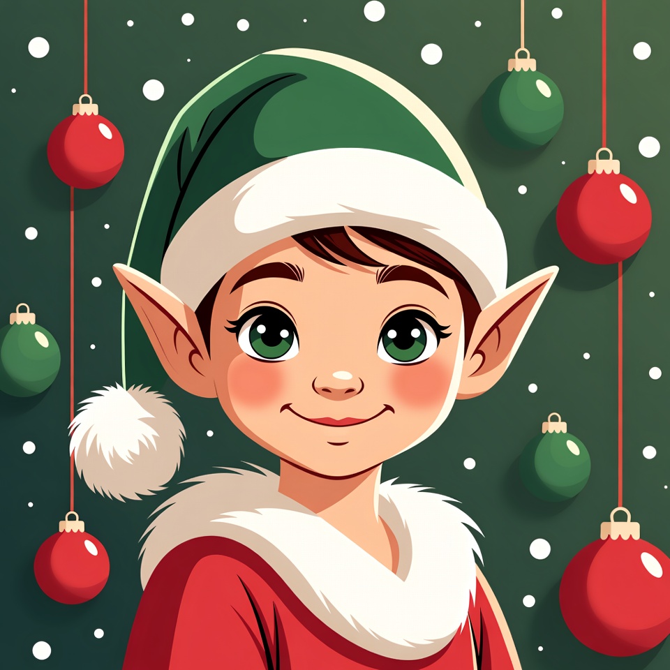 A cute cartoon elf with green hat, pointy ears, and red outfit stands smiling against a green background with hanging red and green Christmas ornaments. The elf has large green eyes, rosy cheeks, and white fur trim on the hat and clothing. Snowflakes and festive decorations surround the cheerful illustration.