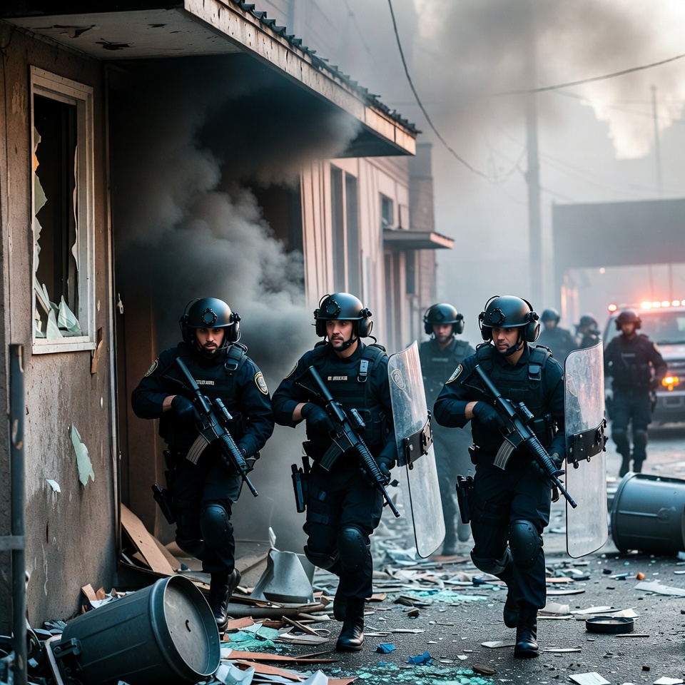 White, black uniforms, burning building, debris, emergency lights, fire, helmets, male, night scene, police, police vehicle, rifles, riot gear, riot shields, running, smoke, street, tactical vest, urban chaos, SWAT team