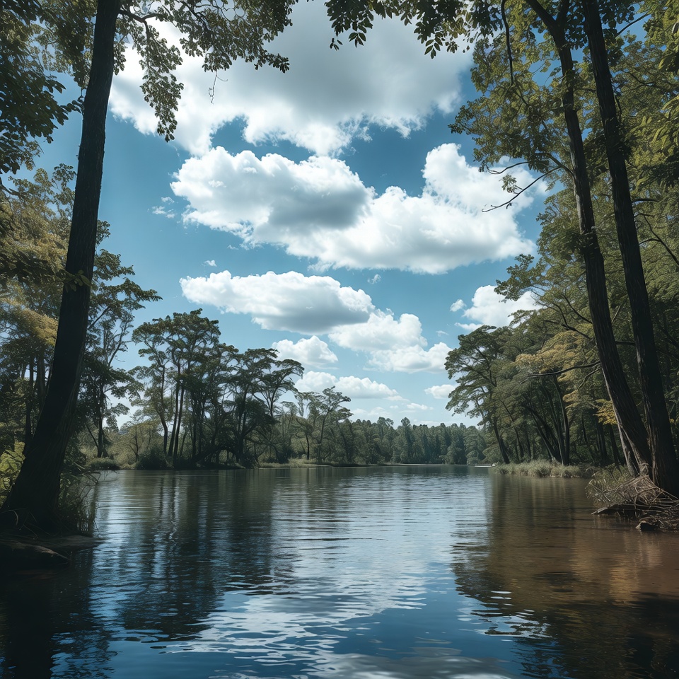 blue sky, branches, calm water, clouds, environment, foliage, forest, green trees, landscape, natural, nature, outdoors, pond, reflection, river, scenery, serene lake, sky, sunny day, swamp, tree lined, trees, water, white clouds, wilderness, woods, lake