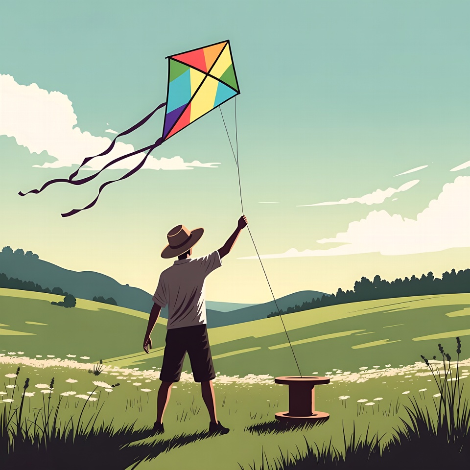 A man wearing a hat, light shirt, and shorts stands in a grassy field flying a large multicolored kite on a string. He holds the string attached to a wooden spool on the ground, with green hills, fields, and clouds in the background. The scene is depicted in a vibrant illustration style.