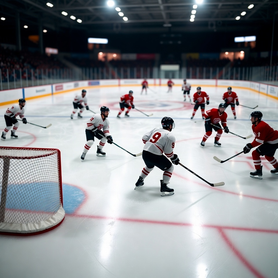 Ice hockey players in red and white jerseys skate on a brightly lit rink during a game. Several players handle pucks and sticks near the goal net, with spectators in the blurred stands. The scene captures dynamic play with goalie defending the net.