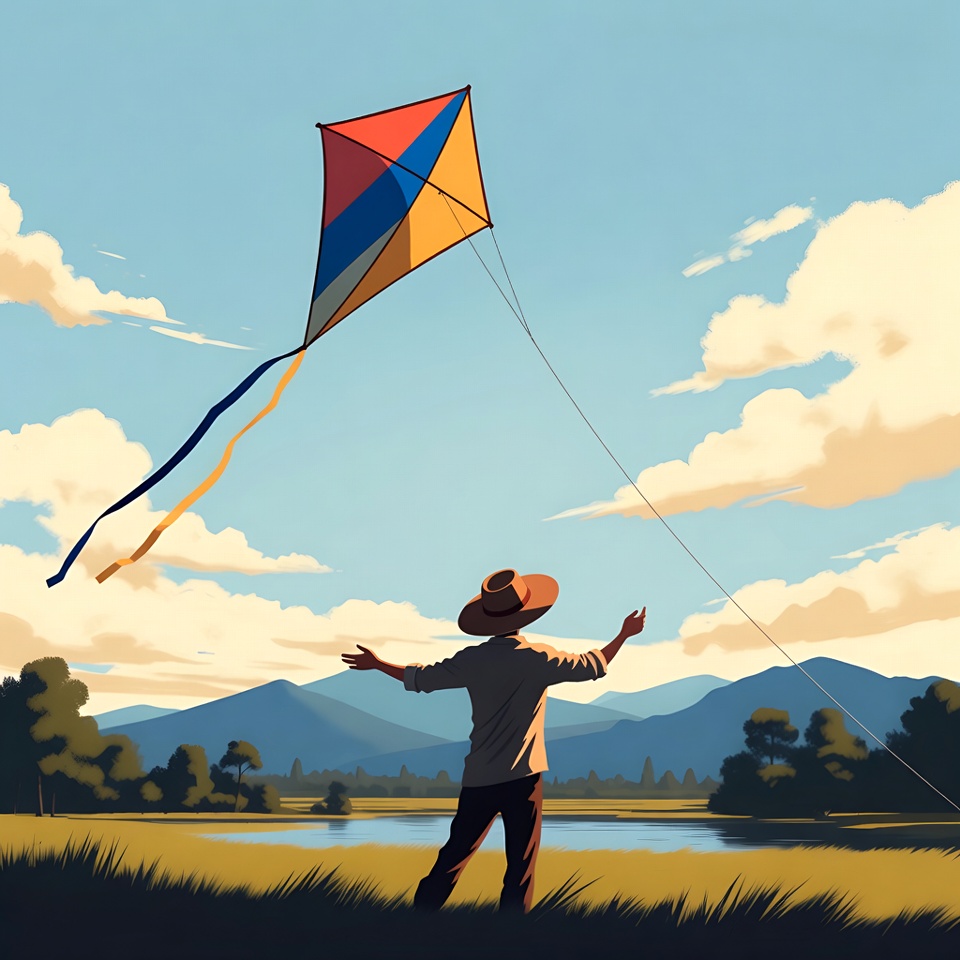 A man wearing a hat stands in a grassy field with arms outstretched, flying a large kite with red, yellow, and blue panels. The scene features a clear blue sky with fluffy clouds, distant mountains, trees, and a lake in the background. The artwork is rendered in a vibrant illustrative style.