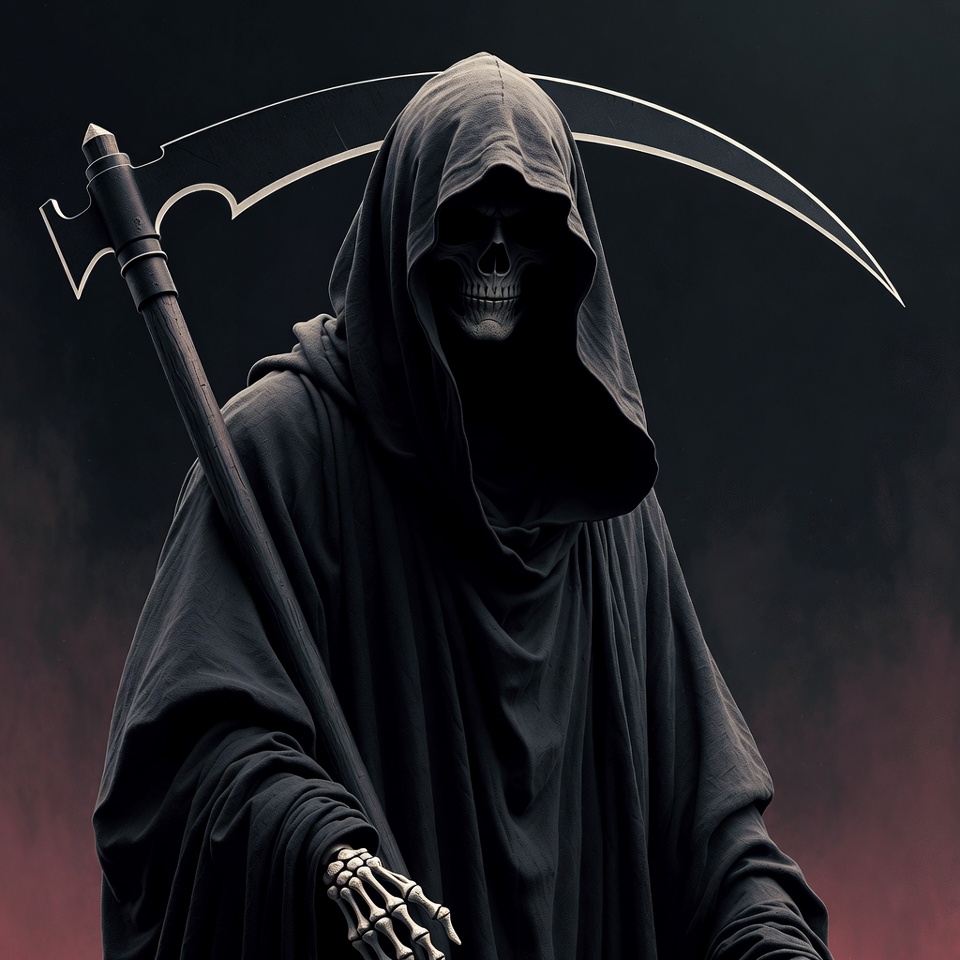 A skeletal Grim Reaper in a flowing black hooded cloak holds a large scythe on a dark foggy background. The figure's bony hand grips the staff, with a prominent skull face visible under the hood. The dramatic lighting highlights the eerie details of the cloak and weapon.