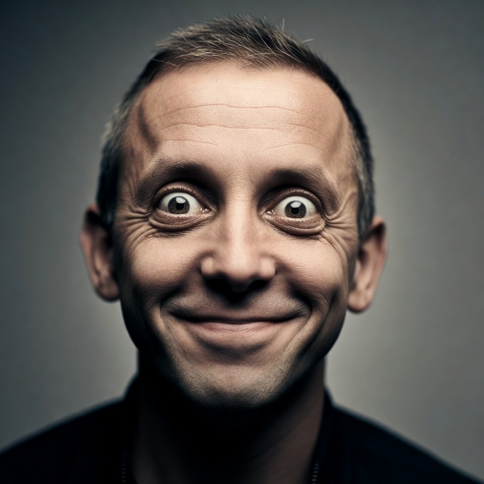 A middle-aged man with short graying hair stares forward with extremely wide, bulging eyes on a gray background. He wears a dark shirt and necklace, displaying a wide, mischievous smile. His facial expression conveys intense surprise and amusement.