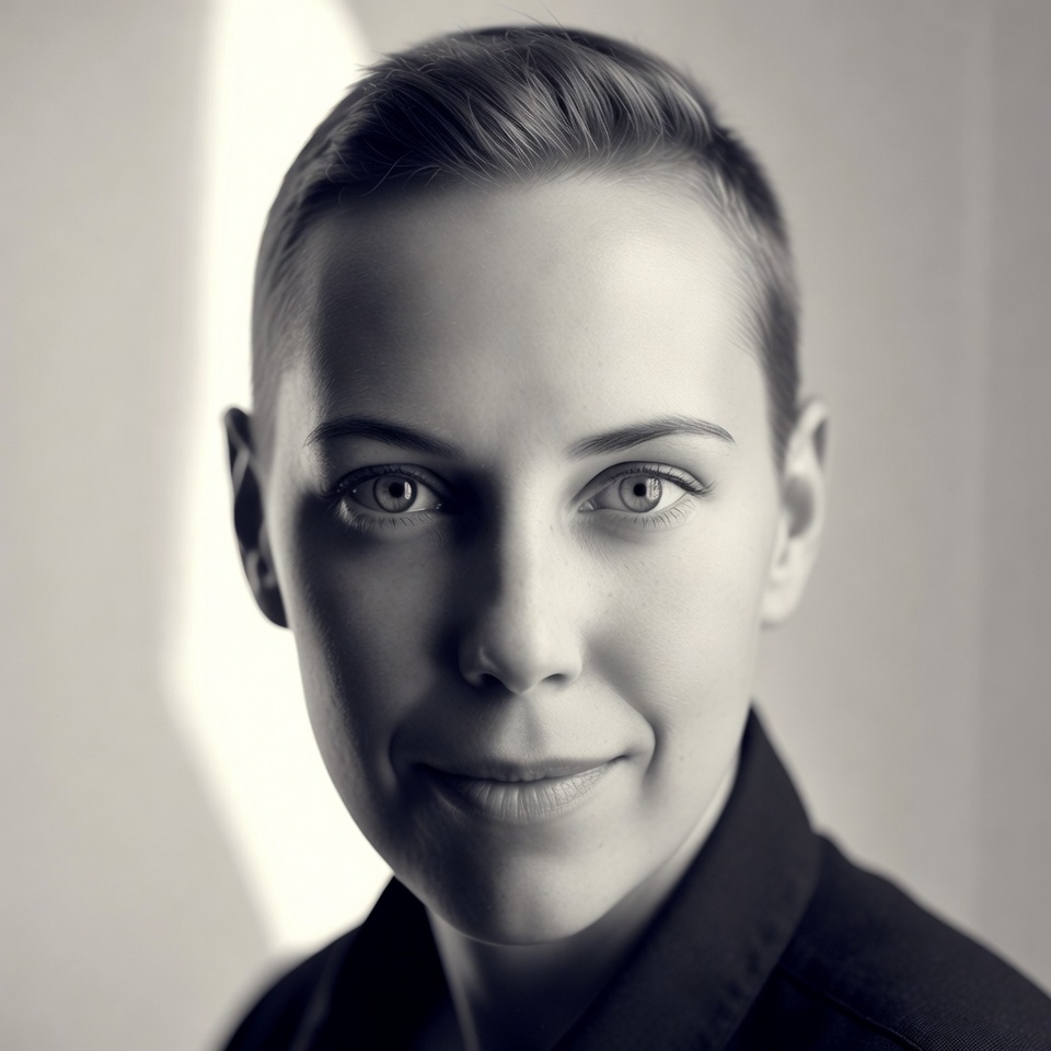 A woman with a short pixie haircut smiles gently at the camera in a black-and-white portrait. She has light eyes and fair skin, wearing a dark collar visible at the neckline. Soft light illuminates her face against a plain background.