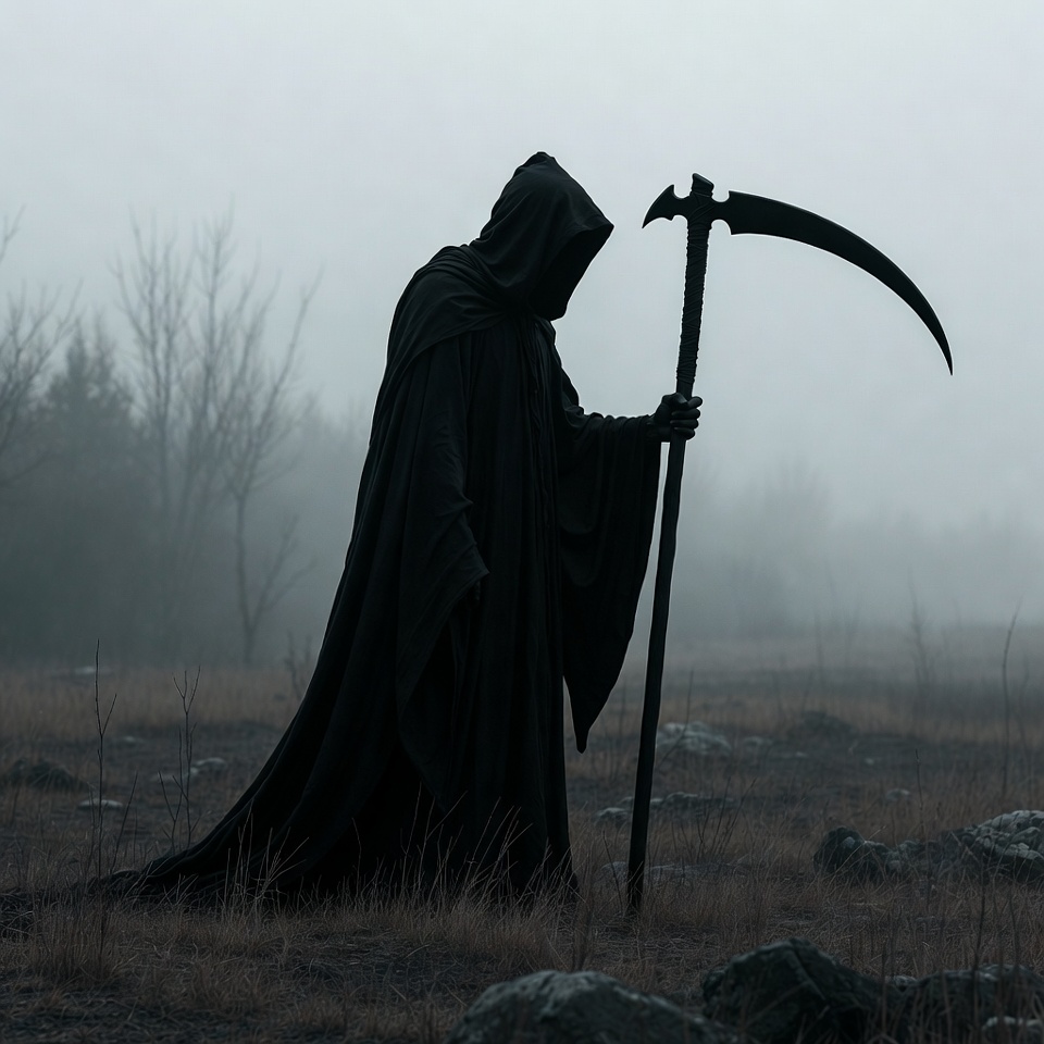 Grim Reaper with Scythe in Foggy Field