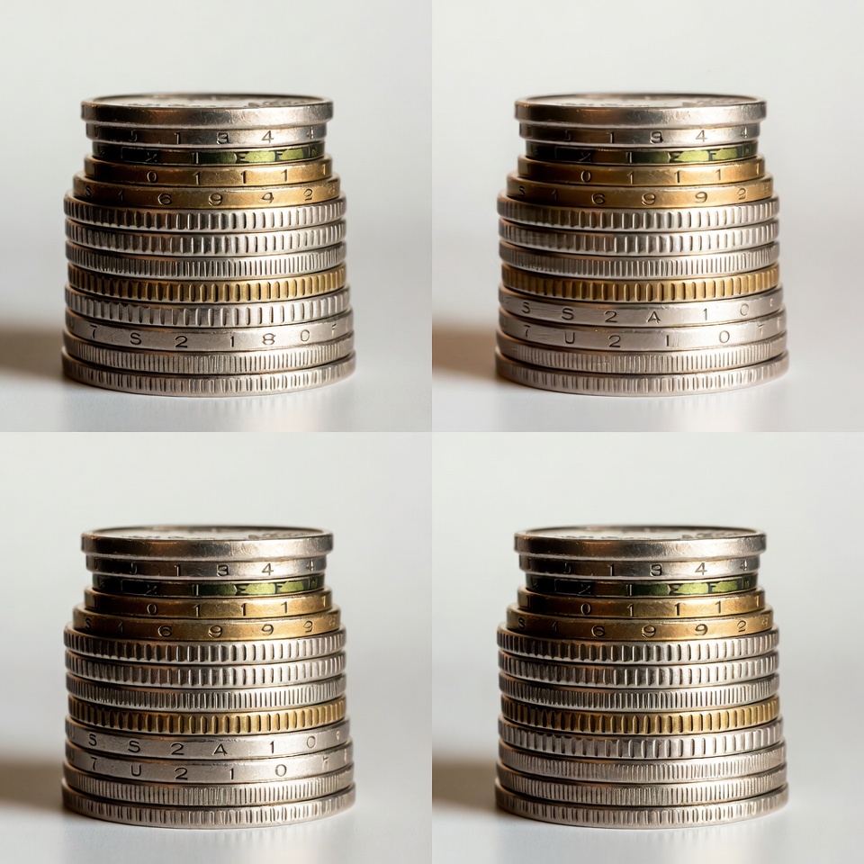 A four-panel collage shows stacks of shiny Euro coins arranged on a white background. Each stack consists of coins in gold and silver tones, featuring denominations such as 1, 2, 5, 10, 20, and 50 euro cents, as well as 1 and 2 euro coins. The coins are precisely aligned in vertical towers, displaying European currency designs.