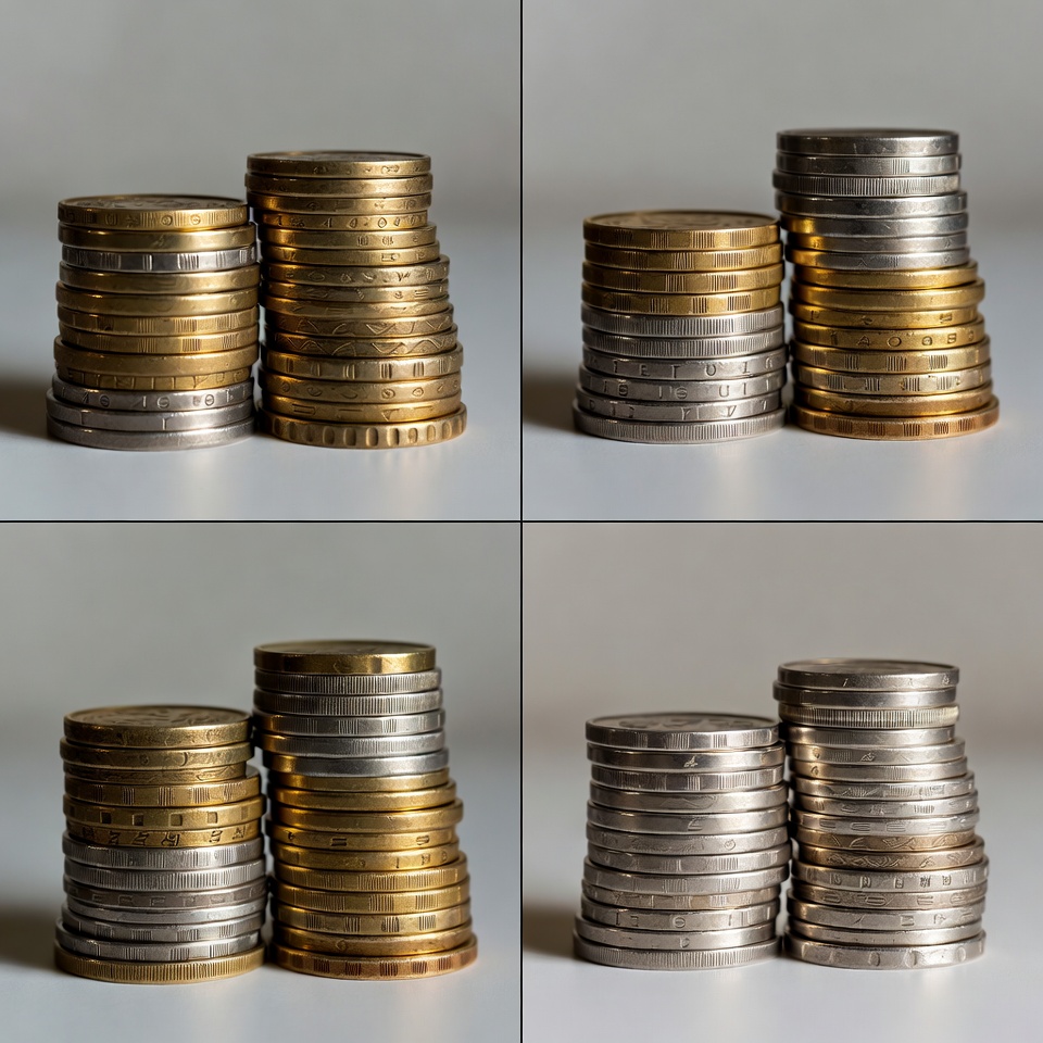 Four images display stacks of gold and silver coins arranged in various combinations on a white background. Each panel shows two tall stacks side by side, with coins in metallic bronze-gold and shiny silver tones. The coins are precisely stacked, creating geometric formations isolated against the plain backdrop.