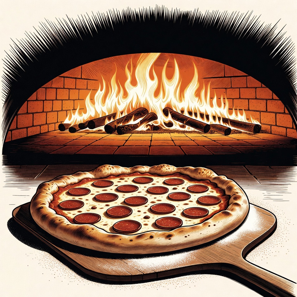 A vibrant illustration shows a wood-fired brick oven with roaring flames and glowing embers. In the foreground, a freshly baked pepperoni pizza with melted cheese and pepperoni slices sits on a wooden paddle. The scene features bold lines and warm colors on an isolated white background.