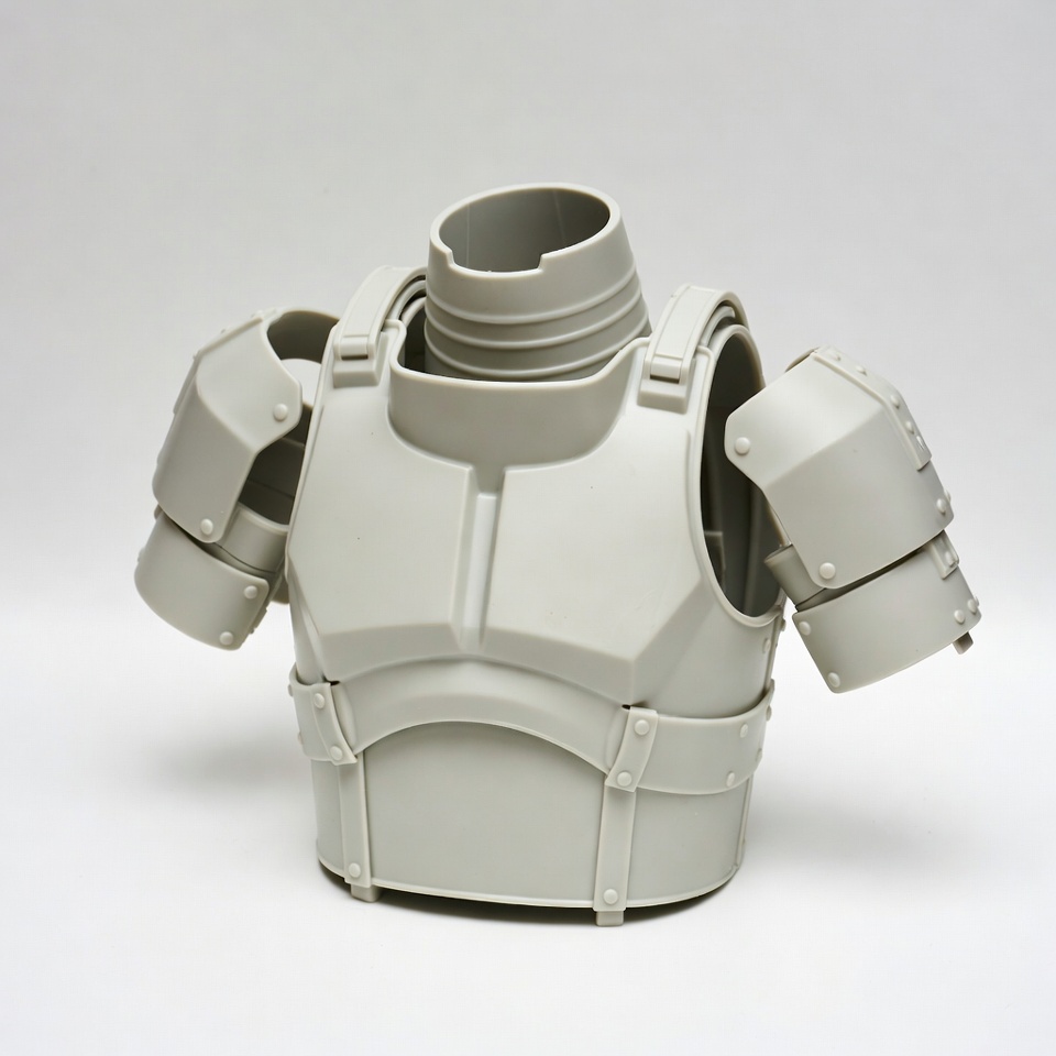 angular design, armor model, armor prop, chest plate, cosplay armor, gray armor, high collar, isolated background, plastic armor, sci-fi armor, shoulder guards, torso armor, white background, futuristic armor
