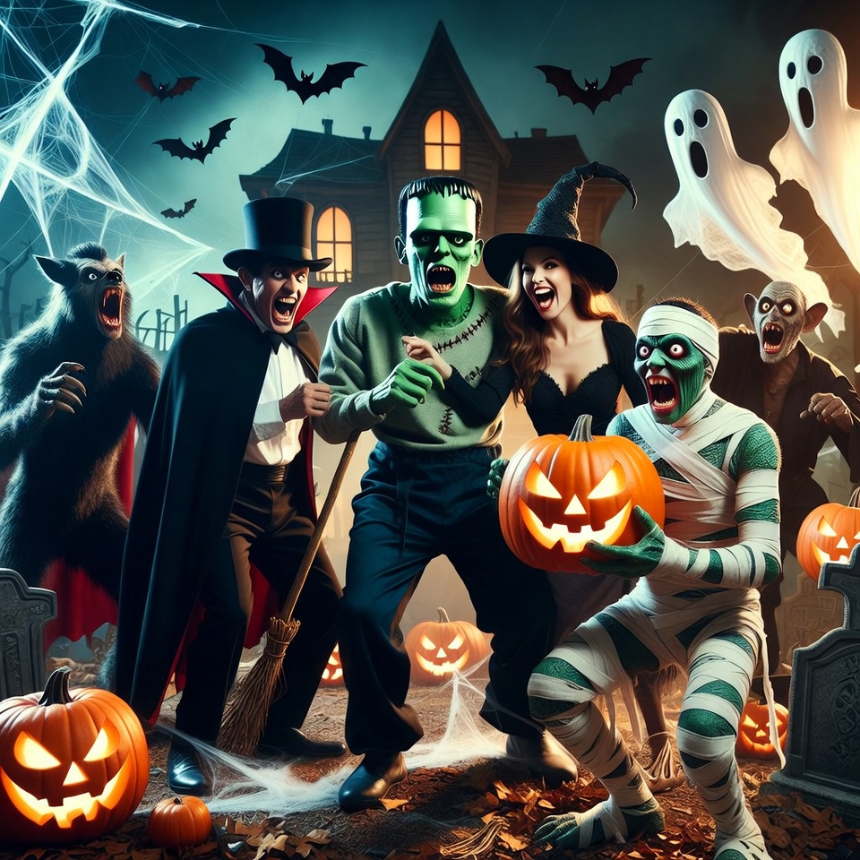 A group of Halloween monsters including Frankenstein, witch, vampire, mummy, and werewolf pose together in front of a haunted house. They hold carved pumpkins and brooms amid spider webs, ghosts, bats, and gravestones on a foggy ground. The vibrant green and orange scene features dramatic lighting and spooky elements.