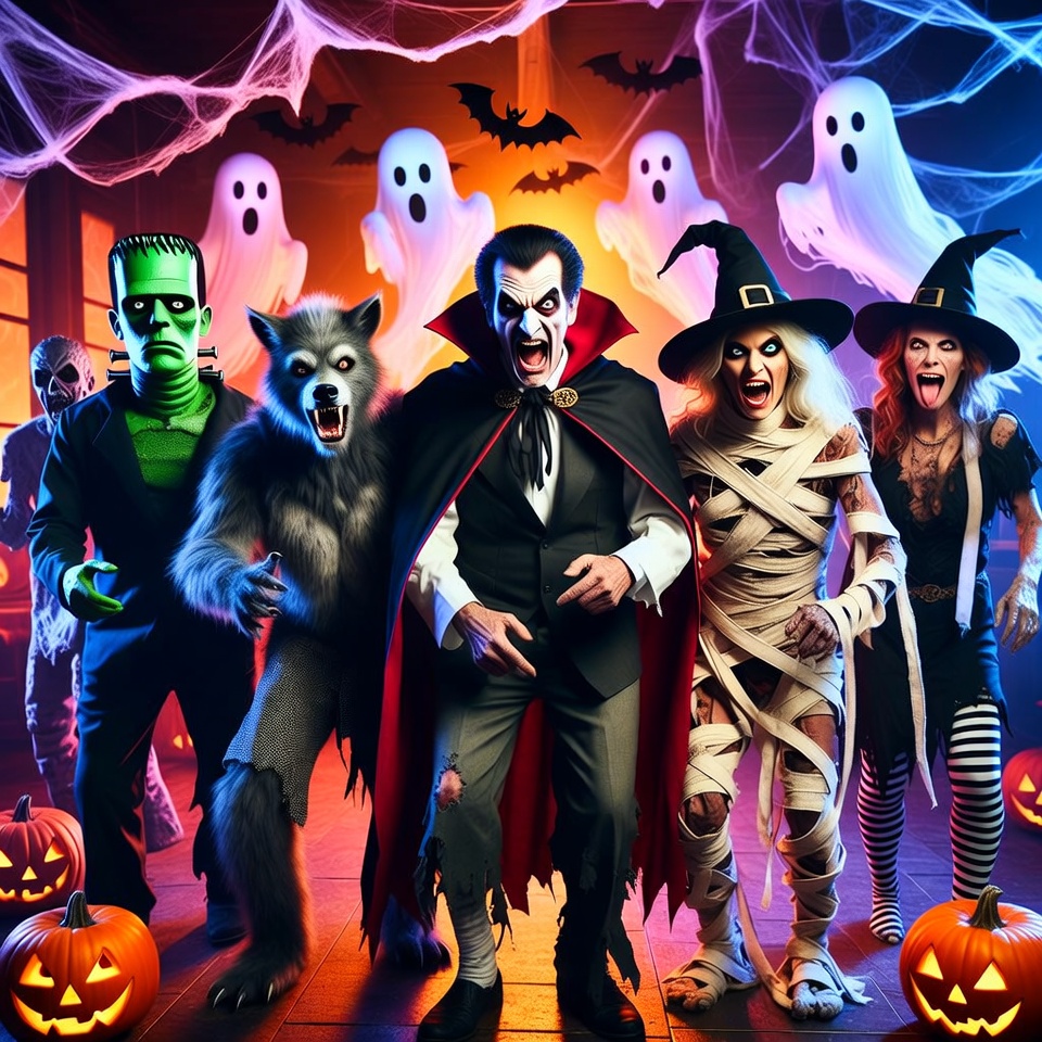 A vibrant Halloween illustration features classic monsters including Frankenstein, Dracula, werewolf, mummy, and witch posing together on a stage. They stand surrounded by ghosts, bats, spider webs, and glowing jack-o-lanterns against a dark, eerie background with neon purple and orange lights. The characters wear detailed costumes with dramatic expressions and dynamic poses.