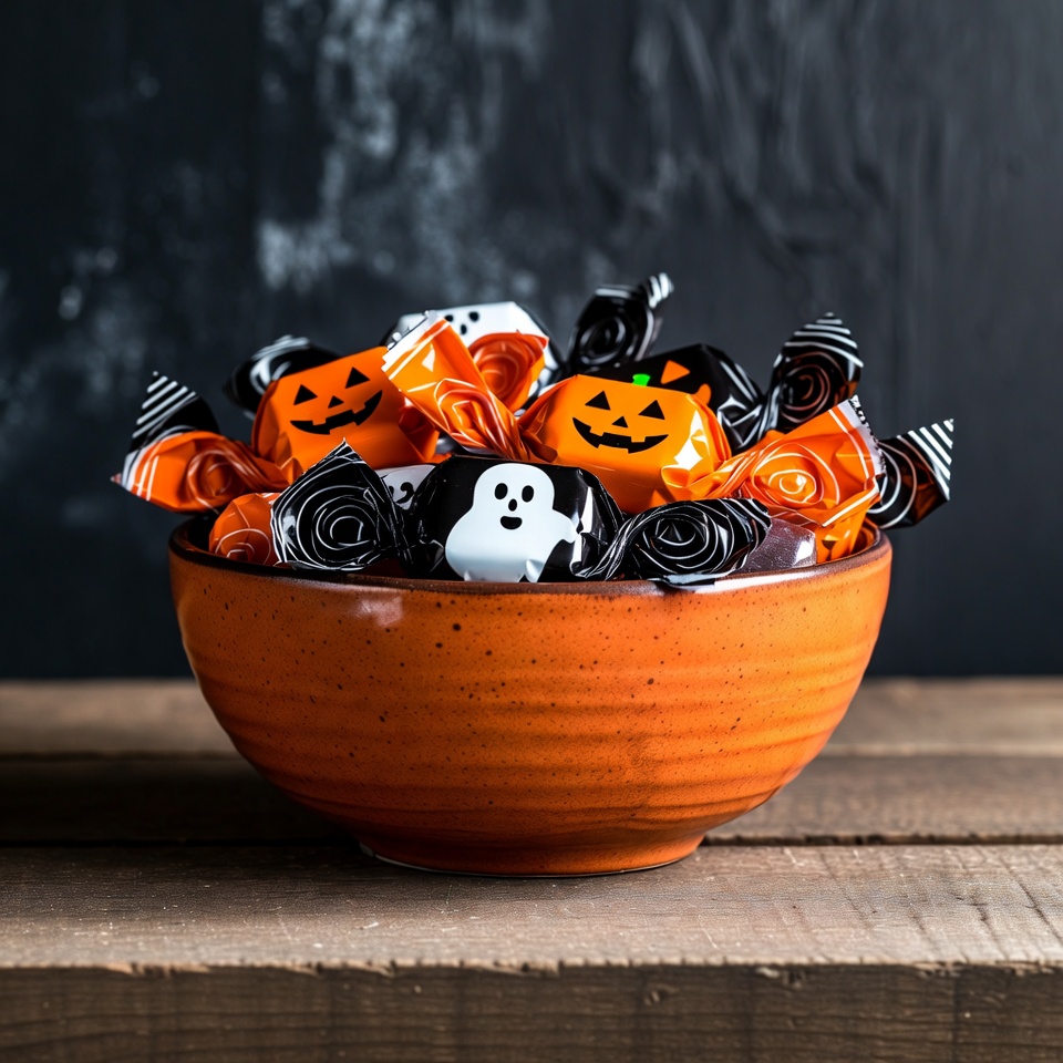 An orange bowl filled with assorted Halloween candies sits on a wooden surface. The candies feature jack-o-lantern and ghost designs wrapped in black and orange packaging. A dark, smoky background enhances the festive Halloween theme.