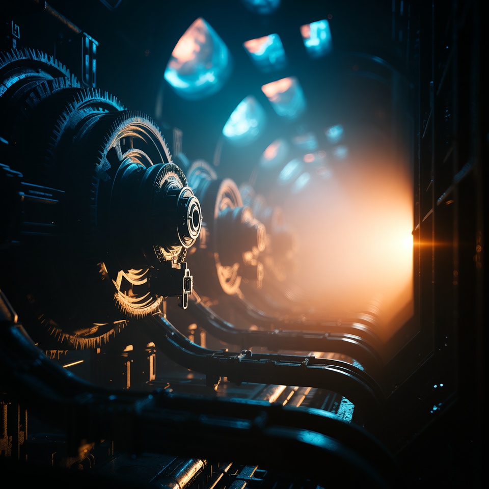 Large metallic gears and mechanical components line a narrow industrial tunnel. Blue and orange spotlights illuminate the intricate machinery with a foggy atmosphere. Glowing lights create depth and a cyberpunk aesthetic in the corridor.