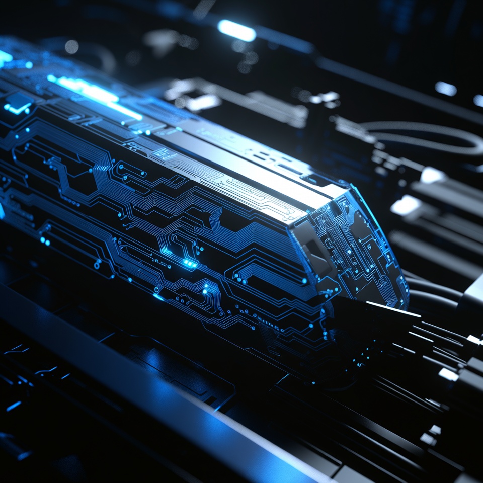 A detailed closeup of a futuristic circuit board with glowing blue neon lights and intricate electronic patterns. The board features metallic components, wires, and emissive traces against a dark background. Highlights and reflections emphasize the high-tech design.