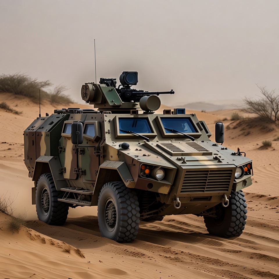 A camouflaged armored military vehicle drives through sandy dunes. It features a mounted machine gun and antenna on top, with large off-road tires. The vehicle has a rugged design suited for desert terrain.