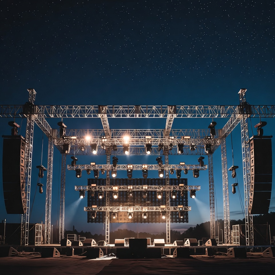 DJ booth, LED screen, dark background, empty stage, event setup, floodlights, illuminated stage, live music, metal trusses, music festival, night sky, outdoor concert, performance area, speakers, spotlights, stage equipment, stage lights, starry sky, truss structure, concert stage
