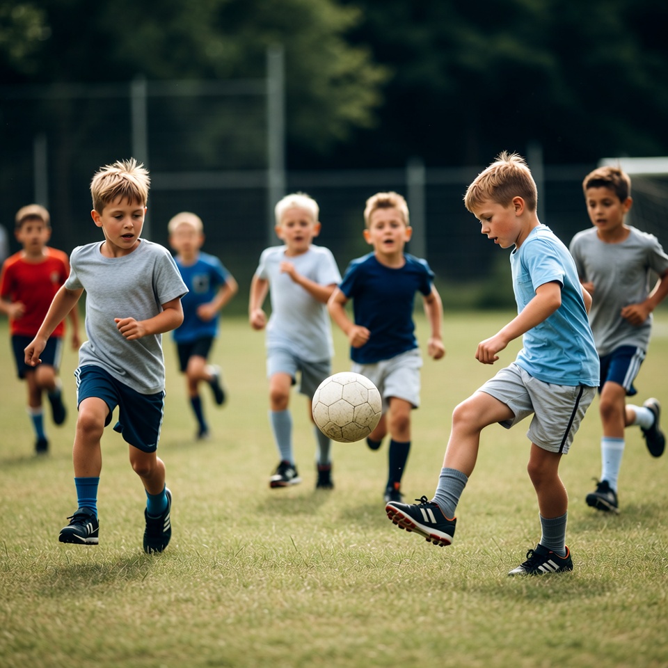 A group of young boys in athletic shorts and t-shirts runs on a green grassy field, kicking a white soccer ball. They wear various colored jerseys and socks, with a chain-link fence and trees visible in the background. One boy in a blue shirt is actively kicking the ball mid-air.